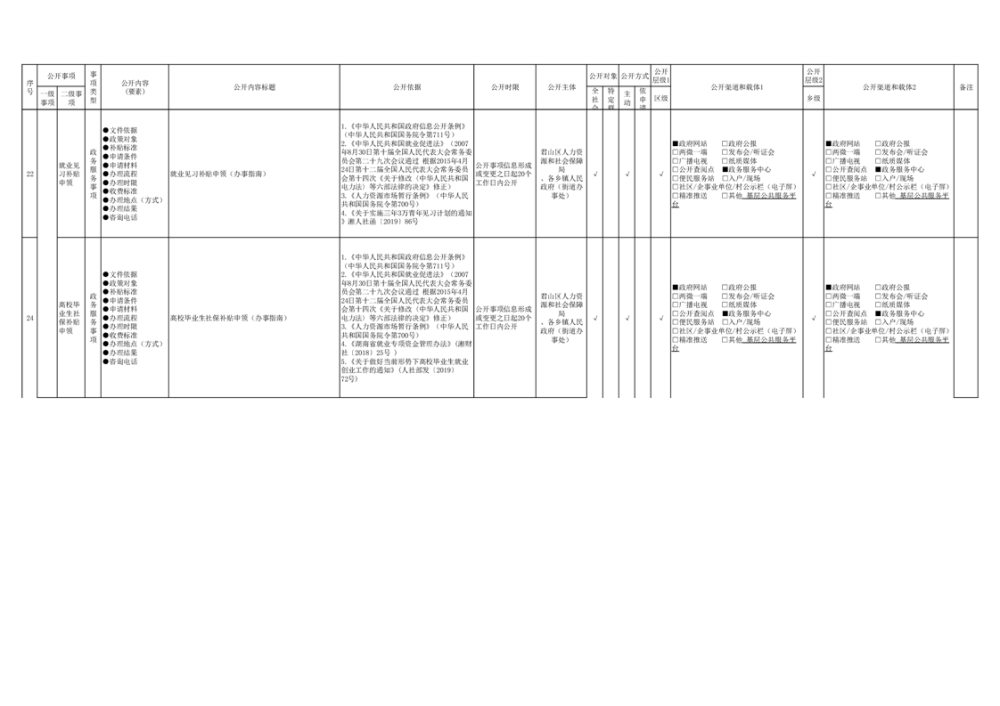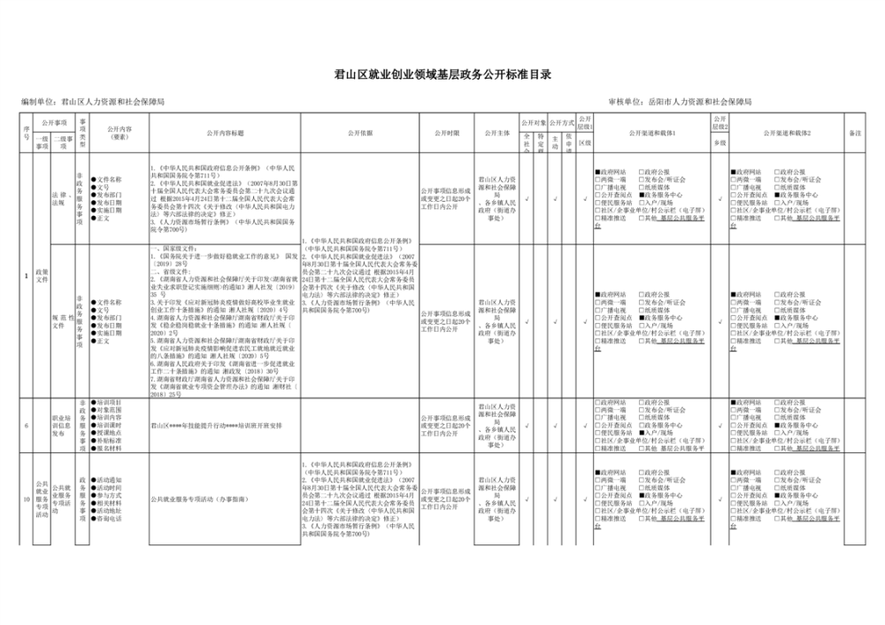 君山区就业创业领域基层政务公开标准目录