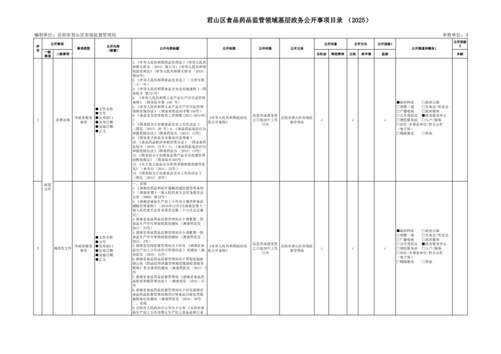君山区食品药品监管领域基层政务公开事项目录(2025年)